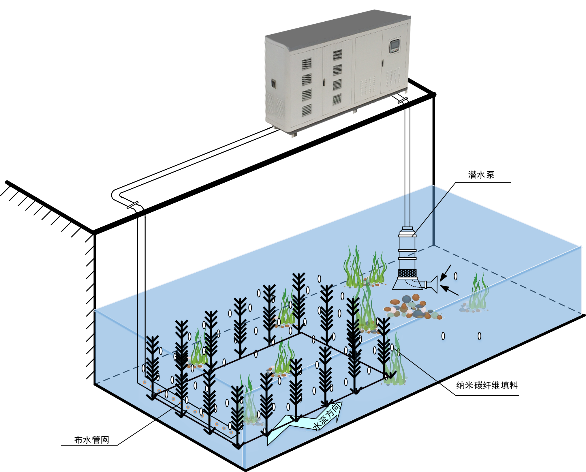 高效富氧濕地產(chǎn)品將純氧設(shè)備與模塊化的潛流濕地相結(jié)合,依靠生物處理技術(shù)聯(lián)用,再生水在進入河道前,先經(jīng)過人工濕地處理,再進入推流富氧生物處理技術(shù)系統(tǒng)。進入人工濕地的再生水呈波形流動,使其在垂直方向上多次經(jīng)過濕地內(nèi)部具有不同處理特性的構(gòu)造層以調(diào)節(jié)再生水在濕地內(nèi)的滯留凈化時間,從而強化對河道水質(zhì)的凈化效果。
