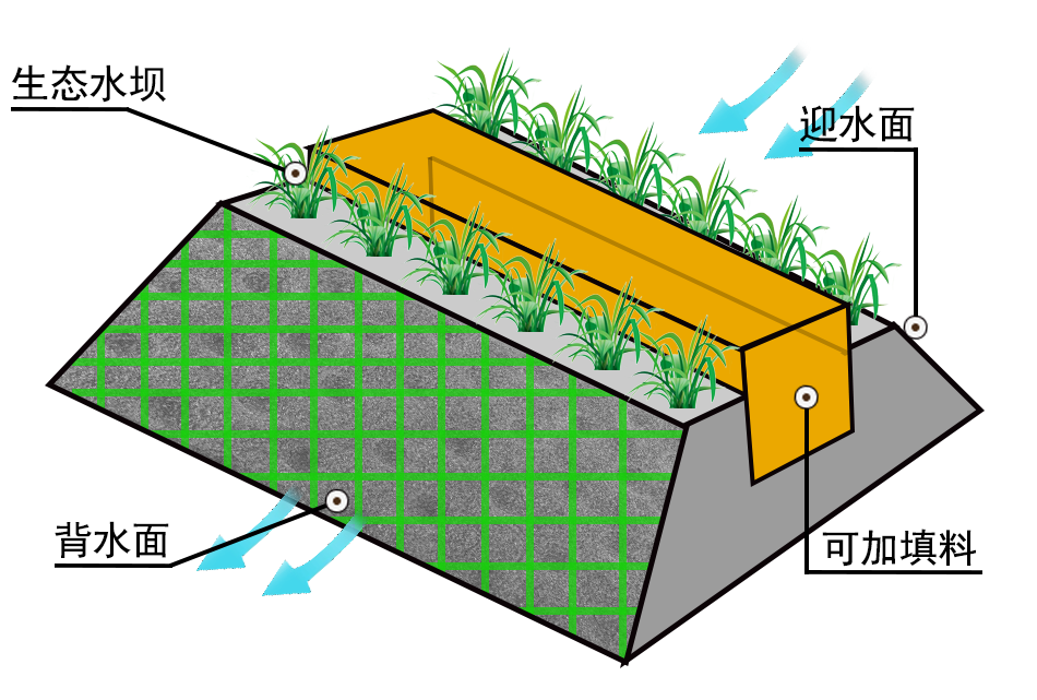 生態(tài)透水壩結(jié)合高效富氧生物技術(shù),水中污染物在物理沉降、自然降解、水生生物吸收的作用下,凈化水質(zhì)。生態(tài)透水壩利用物理過濾、植物吸收和微生物降解。物理過濾在于堆積壩體的濾料之中形成許多空隙,污水在經(jīng)過生態(tài)透水壩時,水中的污染物被吸附和攔截下來。生態(tài)透水壩上種植的水生植物產(chǎn)生的大量根系深入壩體,吸收水中的營養(yǎng)鹽和重金屬。許多微生物和原生動物生長于濾料中,它們利用污水中的營養(yǎng)物質(zhì)生存和繁殖,進而凈化了水質(zhì)。適用于流速緩慢、污染嚴重的非行洪中小河流。